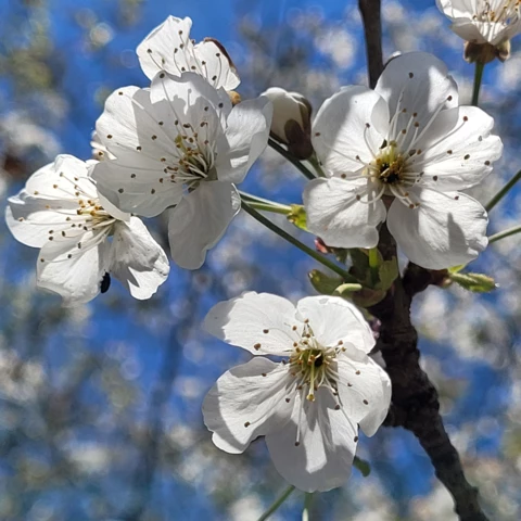 Fleurs de fruitiers à La Ferme des Cinq Terres. Les abeilles s'en délectent, pour donner le nectar du miel de fleur de printemps Les Fabuleuses du Berry (issu des premières fleurs dans notre campagne berrichonne).