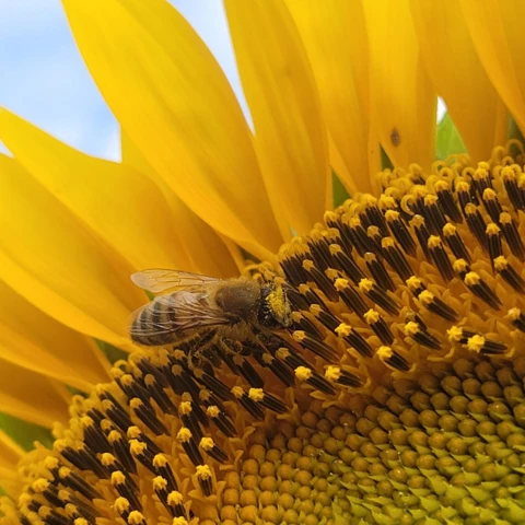 Bain de pollen pour cette abeille, sur un tournesol en fleur, cultivé en bio à La Ferme des Cinq Terres pour Les Fabuleuses du Berry.