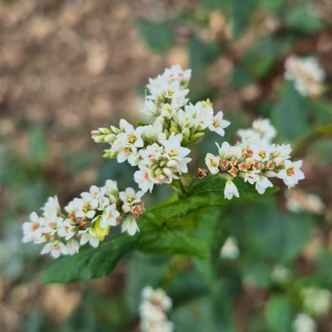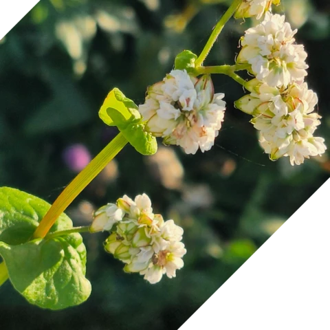 Fleur de sarrasin, cultivé en bio à La Ferme des Cinq Terres. Nos abeilles butinent le nectar, qui donne le miel de sarrasin et fleurs des champs. Un miel de caractère, au parfum singulier et séduisant.